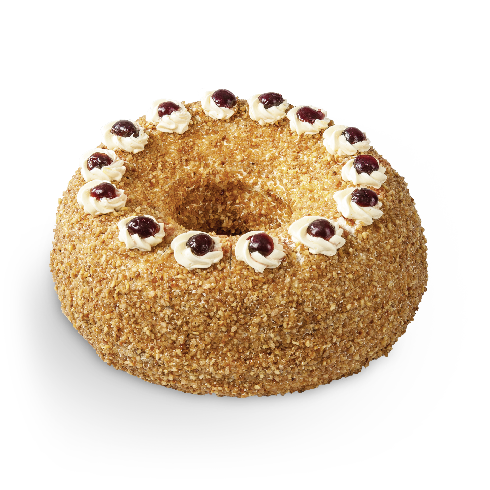 BUTTER, Zucker, VOLLEI, Puderzucker, Wasser, Glukose-Fruktosesirup, Sauerkirschen, WEIZENmehl, WEIZENstärke, Glukosesirup, HASELNÜSSE, Maltodextrin, VOLLEIpulver, LAKTOSE, Kirschen, färbendes Lebensmittel Karottenkonzentrat, Hibiskuskonzentrat; pflanzliches Öl: Raps, Aroma, Karamell, Glukose, Speisesalz, Karottenextrakt, Kurkuma, MagerMILCHpulver, Emulgator: E481; Farbstoff: E163; Geliermittel: E401, E440; Konservierungsstoff: SCHWEFELdioxid; modifizierte Stärke; Säuerungsmittel: E330; Verdickungsmittel: E415.